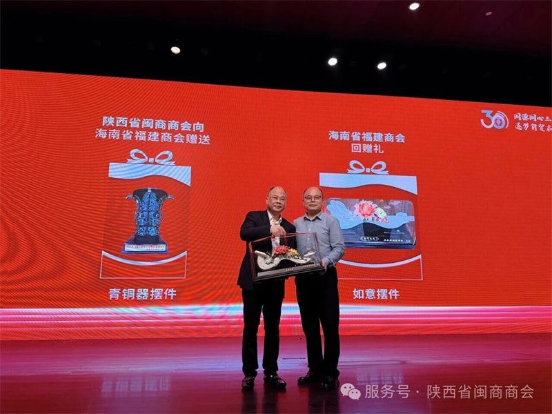 庆典上,陕西省闽商商会与海南省福建商会互赠礼品。 播放了展现商会三十年光辉历程的专题纪录片,发布了记载商会发展史的《福建商会志》,举行了系列战略合作项目签约仪式。现场还表彰了为商会发展作出突出贡献的先进企业和个人,并正式发布了海南省福建商会会歌《向海向南向未来》,将会场气氛推向高潮。